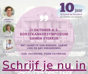 Stichting Jij Speelt de Hoofdrol bestaat dit jaar 10 jaar. Een stichting van borstkankerpatiënten voor borstkankerpatiënten. Zowel vrouwen als mannen. Wij nodigen u uit voor ons symposium “Samen Sterker”, ter gelegenheid van ons 10-jarig jubileum op 31 oktober 2025 in kasteel de Vanenburg in Putten