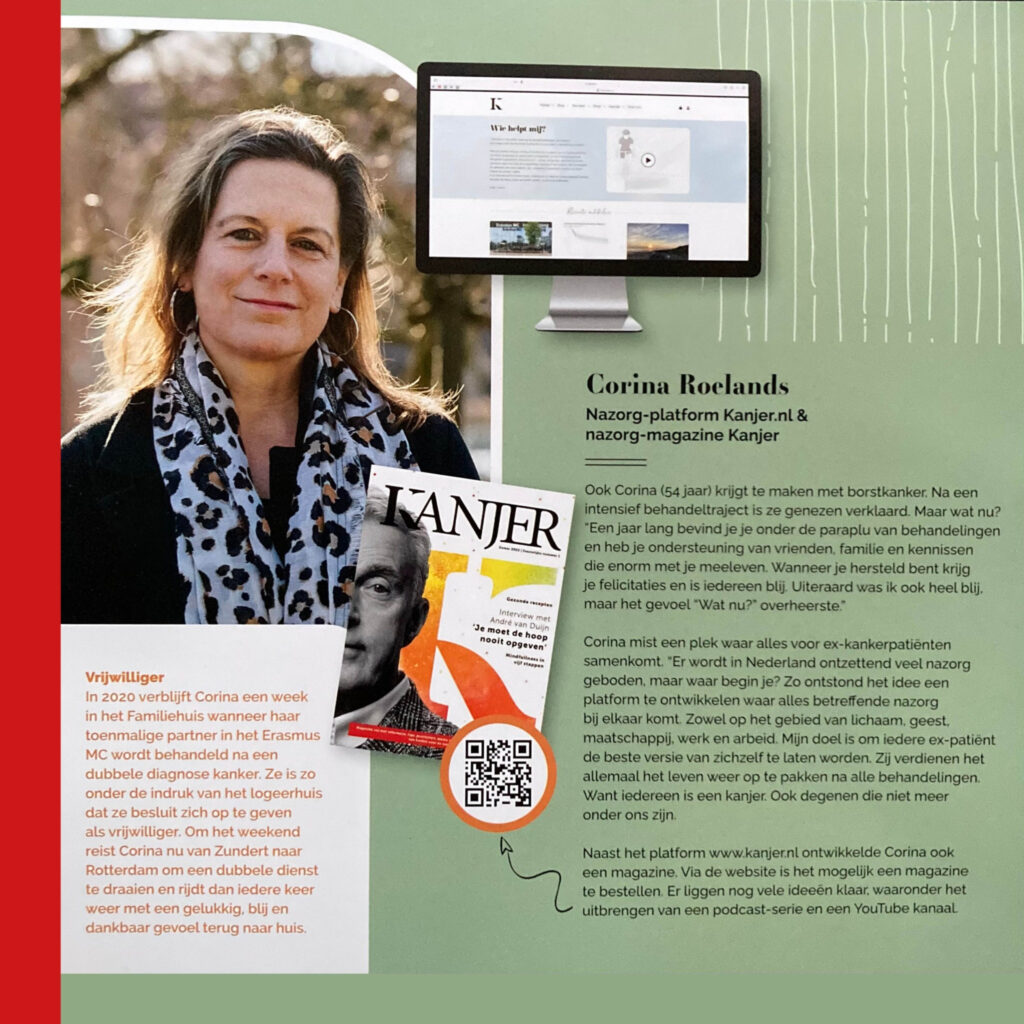 Zoals eerder vernoemd is Corina oprichter van nazorgplatform Kanjer.nl en het Kanjer-magazine, wat in juni 2022 werd gelanceerd d.m.v. een fietstocht langs diverse ziekenhuizen in Nederland.
